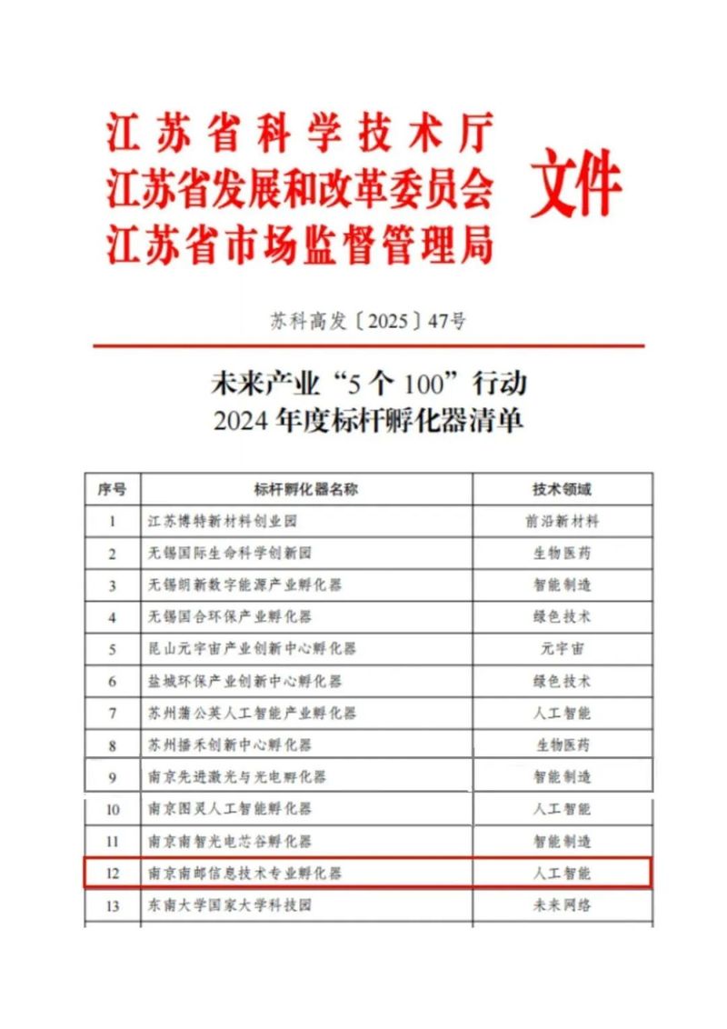 近日,江苏省科技厅、江苏省发改委、江苏省市监局联合发文,公布了2024年度标杆孵化器名单,南京南邮信息技术专业孵化器从全省750余家孵化器中脱颖而出,成功认定为省级标杆孵化器。